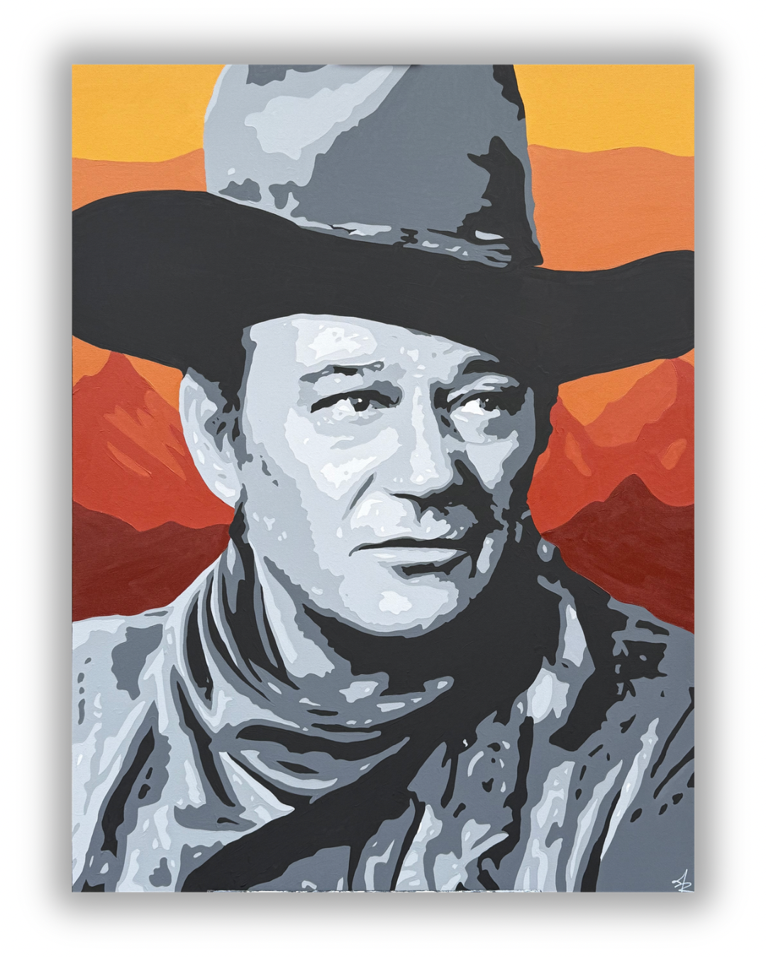 Part of the “A Western Affair Collection, this big and bold original acrylic on canvas of legendary cowboy John Wayne is painted in black and grey against a sun-burnt western sky. It gives steady, grounded, and intentional vibes to any space.